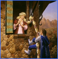 – Я із задоволенням піду з тобою, але не знаю, як мені спуститися вниз. Коли ти будеш до мене приходити, бери кожного разу із собою шматок шовку; я буду плести з нього сходи, і коли вони будуть готові, я спущуся вниз, і ти украдеш мене на своєму коні.