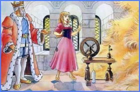 Другого дня привів мірошник свою дочку до королівського замку. Король завів дівчину до кімнати, де було повно соломи, дав їй прядку та мотовило і сказав: