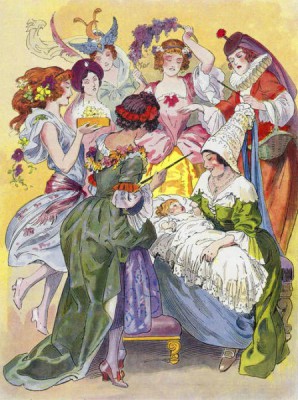 Коли бенкет закінчився, сім фей підійшли до колиски принцеси. Перша фея обдарувала її красою, друга – добрим серцем, третя – привабливістю, четверта – розумом, п'ята – дотепністю, шоста – спритністю, а сьома – чарівним голосом.