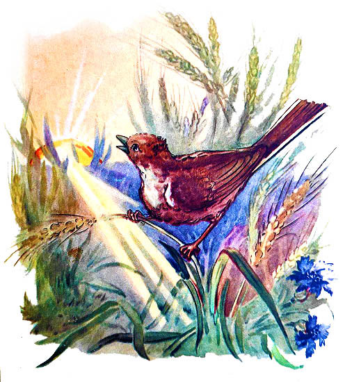 Перший промінь полетів та потрапив на жайворонка. Стрепенувся жайворонок, випурхнув із гніздечка, піднявся високо-високо та заспівав свою сріблясту пісеньку: "Ах, як добре у свіжому ранковому повітрі! Як гарно! Як вільно!"