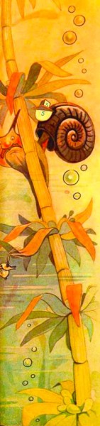 "Не помічаючи Босмінки, Пуголовок злизував з гілки, що впала у воду, наліт водоростей. Мабуть, вони були дуже смачні, бо Пуголовок навіть сопів від насолоди.