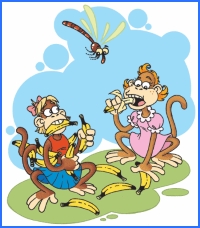 За кілька хвилин хвостаті дісталися галявини. Між листям гойдалися величезні ґрона стиглих бананів. Голодні подруги зірвали кілька кетягів, умостились у затінку й понапихали повні щоки ласощів. Удосталь посмакувавши, вже збиралися повертатися додому, аж раптом схаменулися: хіба можна залишати фрукти напризволяще?