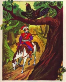 Якось уранці сів він на коня та й поїхав у ліс. Їде та їде лісовою стежкою. Навколо дрозди свистять, туркочуть сиві горлички й десь на дубі виспівує вивільга.