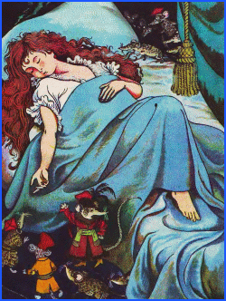 Отож миші, рятуючи себе від згуби, тихцем прокралися в королівську опочивальню й стали чатувати. Ці хитрі створіння вирішили лоскотати сплячу Мармушку хвостиками, аж поки вона випустить з рота перстень. Полоскотали раз, полоскотали другий – нічого не виходить... Лише за третім разом королева засміялася; перстень випав у неї з рота й покотився на підлогу. Кіт уже чекав коло ліжка й, підхопивши перстень, кинувся геть; песик – за ним він так заскиглив і зашкрібся в двері, що служниця, яка спала неподалік, прокинулась і випустила його в двір.