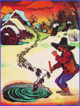 Стукаючи палицею, рушив подорожній до дверей, потім у двір. Миші сунули за ним сходами, подвір’ям, потім дорогою до озера. А була їх сила-силенна.