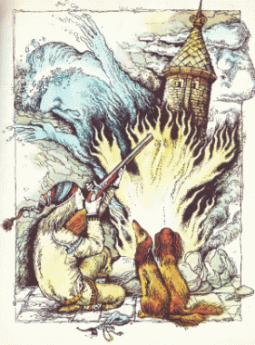 Жаропала. Та Перові собаки також не пасли задніх. Вони накинулися на Потока Шумовода, той з ляку відсахнувся, впав на Вогня Жаропала й погасив його запал, тільки пара засичала.