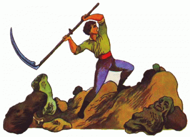 Але той не чекав, поки його вб’ють, а, піднявши косу, кинувся на потвору. Сім разів махав він косою, і за кожним разом одна із змійових голів котилася вниз... Коли впала остання голова, хлопець стрибнув у змієву яму. А в тій ямі було темно, аж чорно, ще й повно смердючого диму, і тяглася вона так далеко, наче й кінця їй не було. В бідного хлопця вже язик присох до піднебіння від спраги та задухи. І тут, коли він ледве живий брів у темряві, десь збоку в розколині засяяло світло й звідти