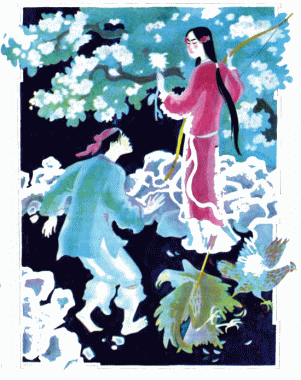 Біля мертвого птаха стояла дівчина. В одній руці вона тримала лук, а в другій – гарну-прегарну хризантему. Зачувши кроки, вона обернулась і подивилася на юнака глибоким, мов вечірнє небо, поглядом. Уздрівши красуню, Хуан Сяо остовпів і забув навіть про курку. Нарешті він почув її ніжний голос: