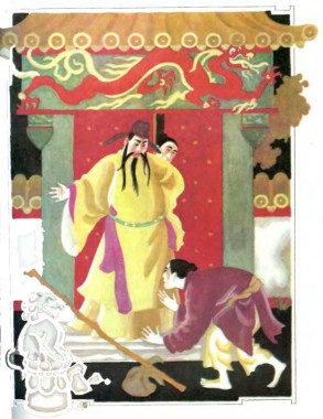 Другого ранку вирушив Баочжу з дому. Сім днів та ночей ішов хлопець, поки нарешті дістався до підніжжя високих гір. Тут він побачив розкішні сади та широкі рисові поля. У першому ж селі, яке йому трапилося, Баочжу зупинився перед найвищим будинком, біля воріт якого стояло два кам’яних леви, а на фронтоні переливалися золотом та сріблом величезні дракони. «Тут, певно, живе найбільший багатій села,– подумав хлопчина.– Як би найнятися до нього на роботу?»