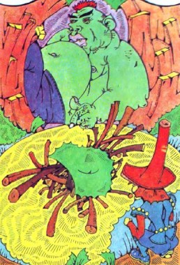 А сам сховався за піччю і став чекати. Чекати довелося недовго. Раптом увесь дім затремтів од важких кроків, то велетень спускався сходами.