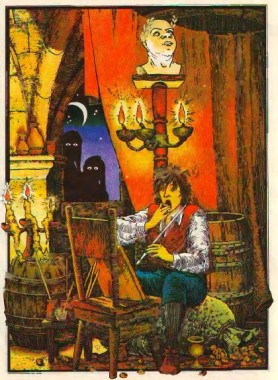 – Тоді заспокойтеся,– каже учень,– і йдіть собі відпочивати, а я намалюю портрет. Тільки дайте мені мішок горіхів та добре барильце апельсинового соку. Я замкнуся в майстерні, а коли відчиню двері – значить, усе готово.