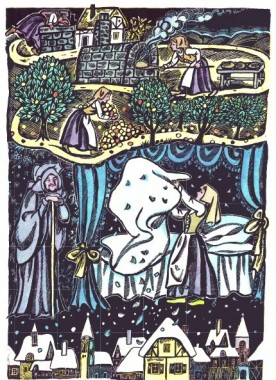 – А чого ти боїшся, люба дитино? Залишайся в мене, і якщо добре впораєшся з хатньою роботою, то й тобі добре буде. Найкраще дбай про постіль, стели якнайстаранніше та добре вибивай подушки, щоб пір’я летіло,– тоді на світі йтиме сніг, бо я ж пані Метелиця.