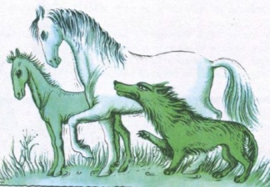 – У мене є паспорт, де записано, хто мій хазяїн. Перш ніж їсти, поглянь документ,– попрохала кобила й підняла заднє копито. Вовк нахилився прочитати напис на підкові, а кобила так зацідила йому в щелепу, що сірий крутнувся млинком і гепнувся на спину. Коли прийшов до тями, кобили з лошам і близько не було.