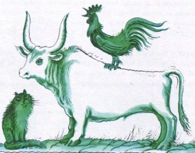 У сиву давнину жив-був господар і мав він кішку, півня та бика. Одного разу під час вечері він звелів наймитові:
