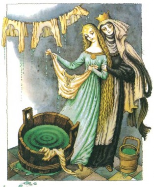 Одного разу, коли в палаці розпочали велике прання і весь одяг вивісили на провітрювання, королівна знайшла в шафі дванадцятеро хлопчачих сорочок. Вона понесли їх матері й запитала, чиї вони.