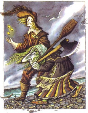Стара погодилась. Вона поклала в човен сокиру й колодку, і попливли вони з вояком через бурхливе море. Але баба веслувала, аж вода вирувала, тож незабаром вони здолали морську стихію.
