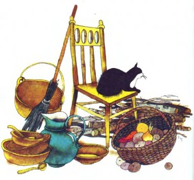 Було, як усі поснуть, шусне гномик у дім, скине свій синій каптанчик і ну трудитися не згортаючи рук. А як упорається з усім, сяде на гладенький теплий камінець біля самої печі, поп’є з глечика теплого молока і, підперши голову рукою, слухає, немов зачарований, нескінченну пісню свого приятеля-цвіркуна.