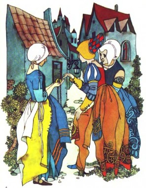 Через сім днів і ночей дісталася Маріон до того міста, про яке казала чарівниця. На вулиці вона познайомилася з балакучою жіночкою і дізналась від неї, що в місті недавно з’явився молодий красень і що відразу вподобав він дівчину. Дівчина гарна з лиця, тільки на вдачу лиха, та ще й завидюща і пожадлива.