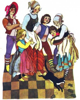 Мав старий мірошник чотирьох синів. Не багатий він був, а все ж таки чотирьох синів виростив і, помираючи, заповів: старшому – вітряка, двом середульшим – півня й драбину, а найменшому – кота.