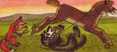 А лисиця плигає через яму та все глузує з вовка і зайця: