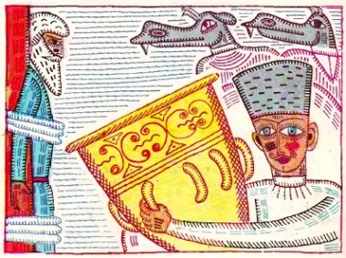 От царенко зв’язав діда і підійшов до вогню. А там стояв величезний казан з дев’ятьма ручками. Підняв царенко однією рукою казана, набрав жару та й знову поставив.