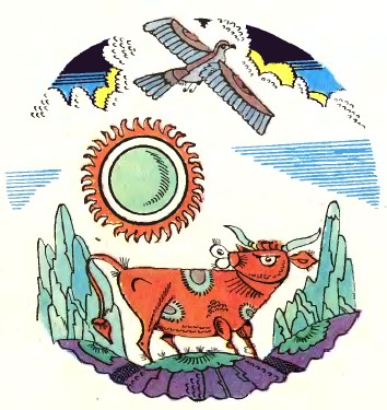 Один велетенський віл блукав міжгір’ям. Усю траву довкола себе поїв, усю воду випив та й став озиратися, потрави та питва шукаючи. А обабіч височіли гори: що одна висока, а друга ще вища. Запримітить віл на сьомій горі траву, потягнеться і дістане її. Потім захоче попити, повернеться, потягнеться через вісім гір і нап’ється водиці з річки.