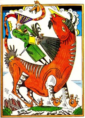 – А я не про це веду з тобою мову – я прийшов по два п’ятаки! – повторив Ведмеже Вухо. Дракон, заскреготівши зубами, кинувся на хлопця. А Ведмеже Вухо, вхопивши його за гриву, вискочив на нього та й давай духопелити. Отак, штурхаючи дракона то в один, то в другий бік, погнав просто до княжого обійстя.